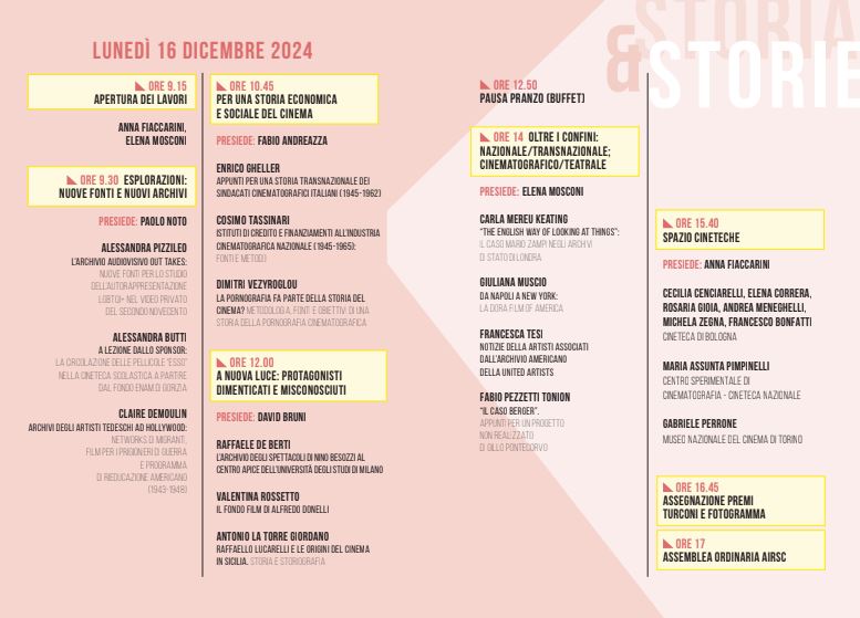 Organizzata dall’Associazione Italiana di ricerche in Storia del cinema (AIRSC), la giornata di studi Storia & storie è aperta ai soci e agli studiosi ed è finalizzata alla presentazione di ricerche in corso e di fondi archivistici, alla condivisione di metodologie di ricerca e alla discussione di questioni di carattere storiografico inerenti alla storia del cinema.